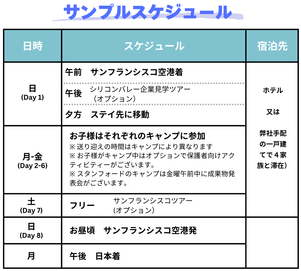 このプログラムでは、お子さまが地元のサマーキャンプやスタンフォード大学でのサマーキャンプに参加する間、保護者の方はAirbnbやホテルなど近隣の宿泊施設に滞在することができます。